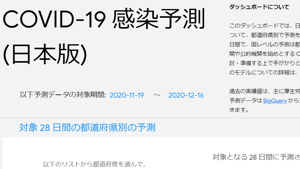 このダッシュボードでは、日本国内の COVID-19 (新型コロナウイルス感染症) の感染の広がりについて、都道府県別で予測を表示しています。(中略) これは、医療機関や公的機関を始めとする COVID-19 の影響を受ける組織が、今後に向けてより適切な対処を検討・準備する上で手がかりとなる情報の一つとして利用されることを目的に公開しています。