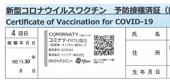 2回接種済の予防接種済証。外国で通用するようCertificate of Vaccinationと表記されている。そういえば、輸出書類の原産地証明をCertificate of Originということを思い出した。
