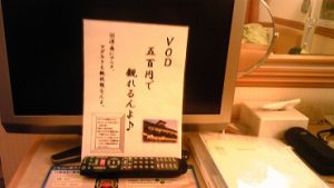 部屋に入ってまず驚いたのは、アダルトビデオ(AV)のパンフレットが一番上に置いてあったことである。おまけにテレビ画面には、オンデマンドでAVも見られますという注意書きがわざわざ立てかけてある(下の写真)。AVを置かないというのはそれなりに品位あるサービスだと思っていたのに、東横インにとっては単なる経費節減策だったようである。