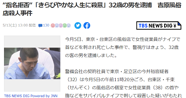 吉原の風俗店で女の子を刺殺した男が逮捕された。普通に歩いて連行されていたから、自分をナイフで刺したといっても形だけ傷つけただけだったんだろう。