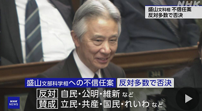 統一教会から推薦を受けて立候補、政策協定にサインまでしていた盛山大臣が、まさに統一教会の解散命令を出す立場の文科大臣には不適当と不信任案が出されたのに対し、自民・公明・維新の反対多数で否決された。