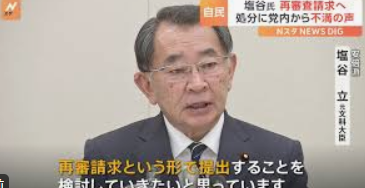 自民党の処分に異議を唱えた塩谷元文科相。派閥代表にはなるけれど責任はとりたくないという恥ずかしい人間である。黙って泥をかぶれと思う。