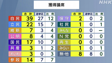 午後8時の出口調査分析では、自民党20台とか、1人区一桁惨敗という予想も出ていただけに、過半数に2つ届かない(和歌山は二階が負けただけで自民)というのは言われるほどひどくなかったということ。党重鎮(麻生?)の「石破はスリーアウトチェンジ」発言も、翌朝には報道されなくなった。
