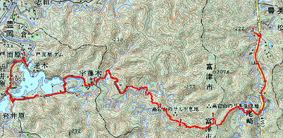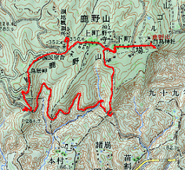 家に帰ってからGPSデータをカシミールに落としてみたところ、撤退地点までは市町村界を忠実にたどっていて、行き着いた場所は1/25000図上では林道が通っているはずのところなのである。ちなみに木之根峠はその先の鞍部で、市町村界をそのまま進み標高差で40mほど下っているように見える。