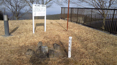大山林道の最高点にあたる部分から、踏み跡をたどって尾根を登ったところが御所覧場。「嶽神」の碑と石仏、石臼のようなものが置かれています。