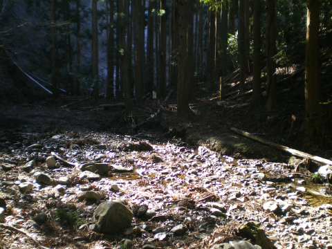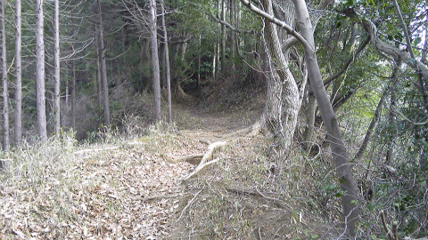 谷沿いの細い道は斜めっている上にすれ違い困難なほど狭く、谷にかかっている丸太橋は半ば腐ってしまっている。その奥には田圃があるし、宅地の跡らしき平地もあるので百年くらい前にきっと人が住んでいたのだろうが、いまでは水仙畑が少し残っている他は荒地となっている。そこから上は深くえぐれた登山道である。