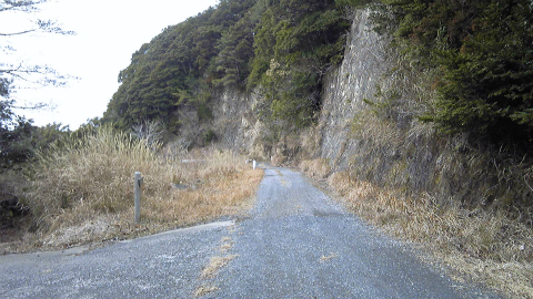 1/25000図によると、この林道の途中に田倉集落に下りる登山道があるらしいので道路の右側を注意して歩いていたのだけれど、右側にはずっと「路肩注意」と書いてあり、谷に落ち込んでいるか急斜面かどちらかで、道らしいものは見当たらなかった。ただ、石射太郎への道案内はずっと続いていたので、方向的にはここを進めば、どこかで鹿野山に登る道にぶつかるはずである。