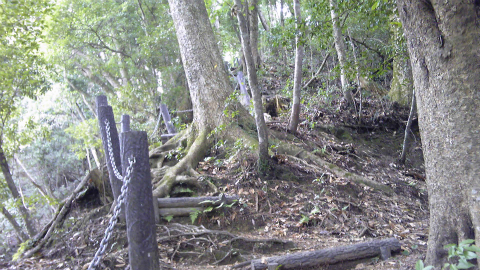 余人はともかく、体重約100kgの私が乗って木の根が折れないという保証はない。計画を断念し木之根峠はあきらめることにした。こんな危ない場所が本当に官道だったのか首をひねりながら登ってきた尾根を戻る。あるいは、ここの道はもともとヤセ尾根であったものが、大雨か何かで地崩れを起こしてしまったのかもしれない。