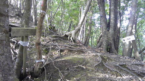 さて、木之根峠はこの先なのだが、行先表示もなければ赤テープも見当たらない。唯一手がかりとなるのは頭を赤く塗った杭で、おそらく市町村の境界を示すものと思われた。コピーをとってきた「房総の山歩き」には、「自然林の尾根を少し行き、道は尾根の西側山腹をたどるようになる」と書いてあるのだが、少しというのはどの程度なのだろう。