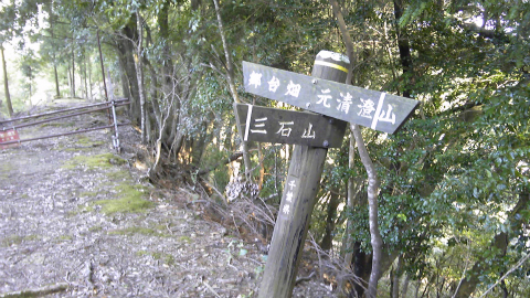次に失敗したら清澄寺まで戻るしかないと思ってさらに100mほど進むと、北側の斜面を登る道があり、「三石山」の手作り標識がご丁寧に2つも置かれている。行きにちゃんと前を向いて歩いていれば見逃す場所ではないのだが、何をぼんやりしていたのだろう。時刻は13時30分、頂上から35分だから、分岐が分からないでロスした時間は10分くらいだったはずだ。