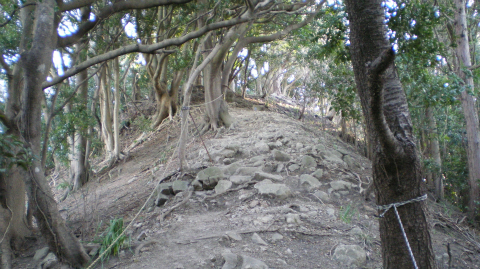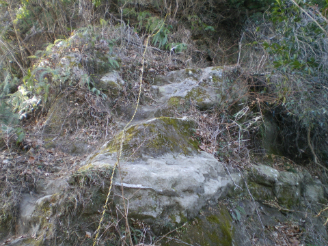 トンネルの高さくらい登ったかなと思えた頃、右に方向転換。さらに急こう配を登る。左が切り立った崖になり、トラロープを引いてある部分をクリアすると、やや太くなった登山道に出た。田倉集落から鹿野山への古道「田倉みち」である。「房総のやまあるき」では田倉集落に出てこの道をたどることになっており、ここでようやく、モデルルートに戻ったことになる。