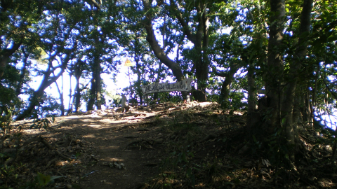 尾根を外さないように高い方へ登って行くと、次第に踏み跡がはっきりしてきて、小高いピークの上に自然石を削った石碑が見えてきた。「嶽神」と彫ってあり、おそらく山の神を祀っているのだろう。傍らには小さな石仏の観音様もある。ここが御所覧場で、昔、里見の殿様が振り返って安房の景色を望んだ場所ということである。いまは木々が茂って展望は開けない。