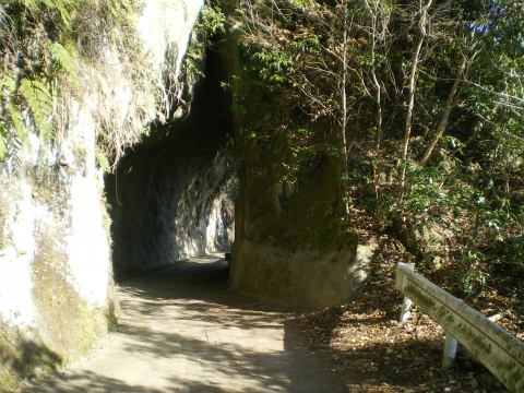 さて、次の目標となるのは「房総のやまあるき」で言うところの彫刻家の家である。彫刻家の家から、「舗装路は右におりるが、それを行き、左手一軒家先を左に入り石段を下りるとトンネルに出、前方に古道入口がある」というのだが(w)、そもそも道路はあるけれど人家は見えない。方向は合っているから大丈夫だろうと歩いていたら、道から引っ込んだところに倉庫のような建物があった。