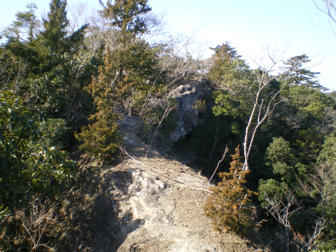 とうとう尾根道は、左が崖というとんでもない場所にさしかかる。見た目20mくらいは垂直に切り立っている。足を滑らせたら、ケガで済むかどうか微妙なところである。そして、足もとの木の根の間から中空が見える。どうやらオーバーハングしているようだ。