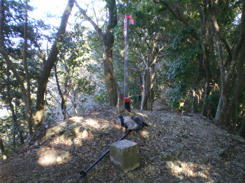 標識にしたがって急斜面を登る。左右にトラロープが張られ、足下は乾いていて滑りやすい。2つ3つコブを越えると、大きな石碑の立ったピークに出た。南側の谷に向かった斜面には水仙が植わっているので、ここが水仙ピークなのだろう。残念ながら水仙の盛りは過ぎてしまっていた。