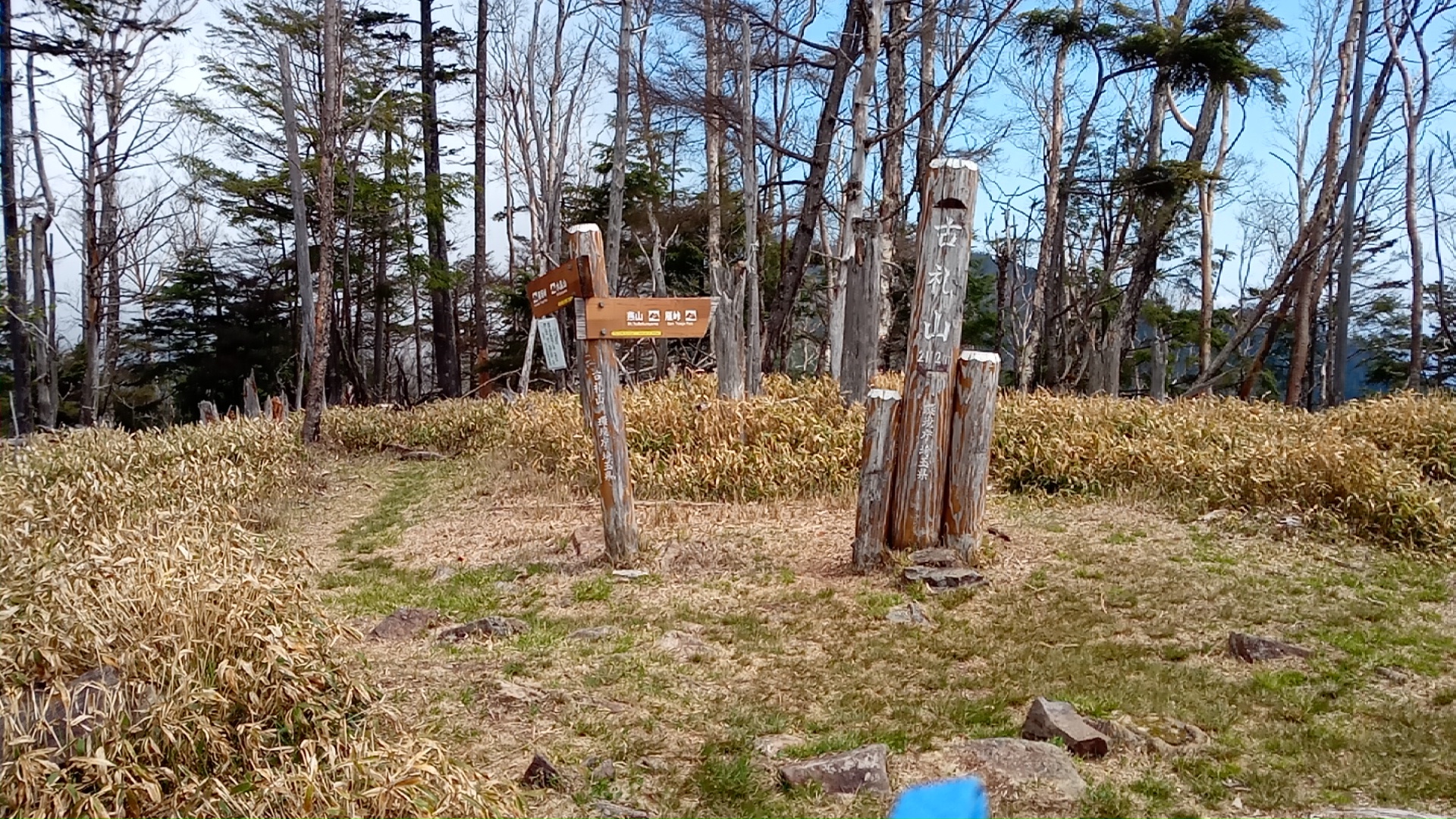 9時20分到着。山名標は環境庁と埼玉県が立てた木製のもので、環境庁というくらいでもう古くなって傾いている。東京都と違って、石造りの頑丈なものにする資金力はないみたいだ。ただ、「古礼山」という名前とはフィットしている。