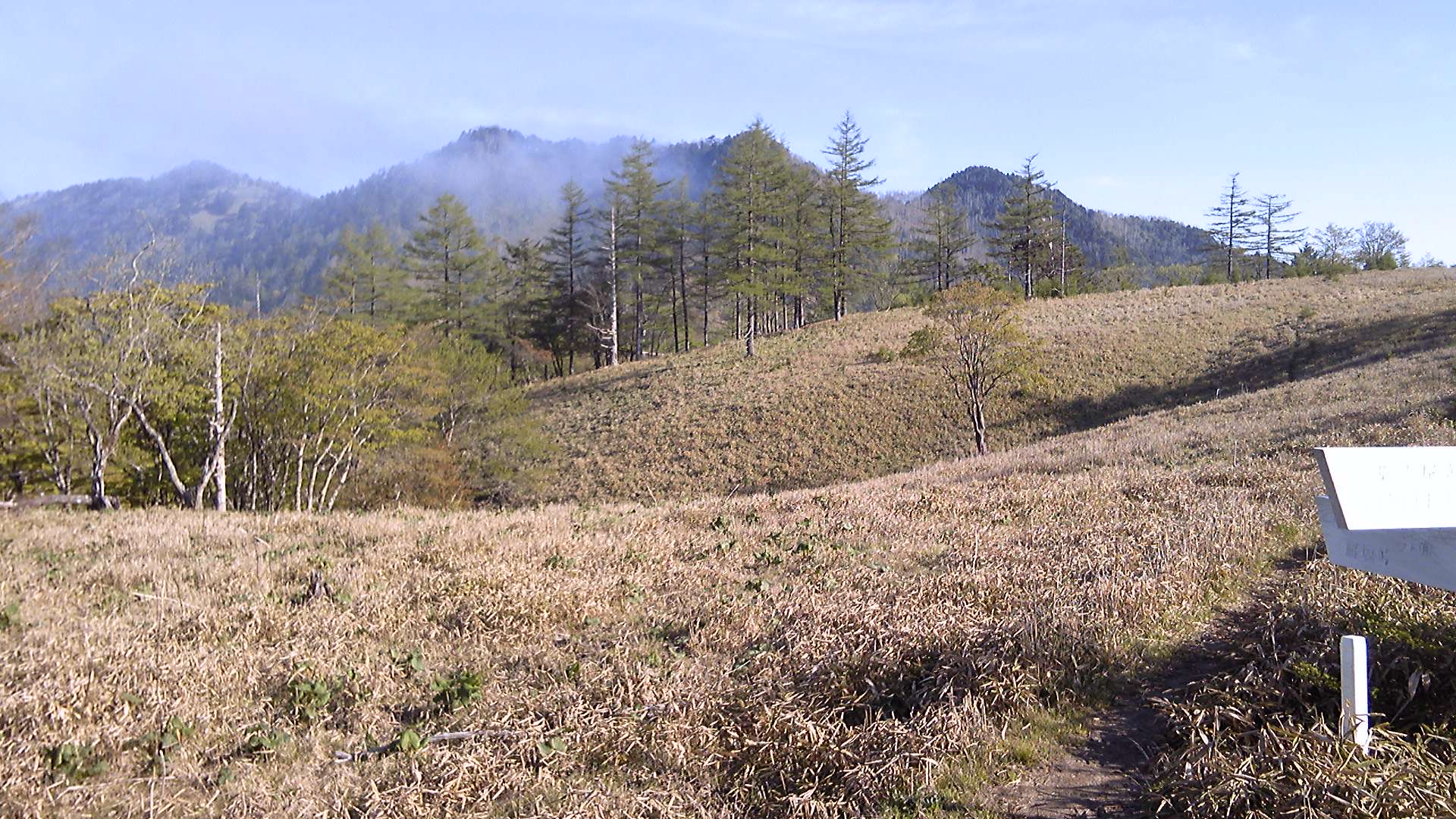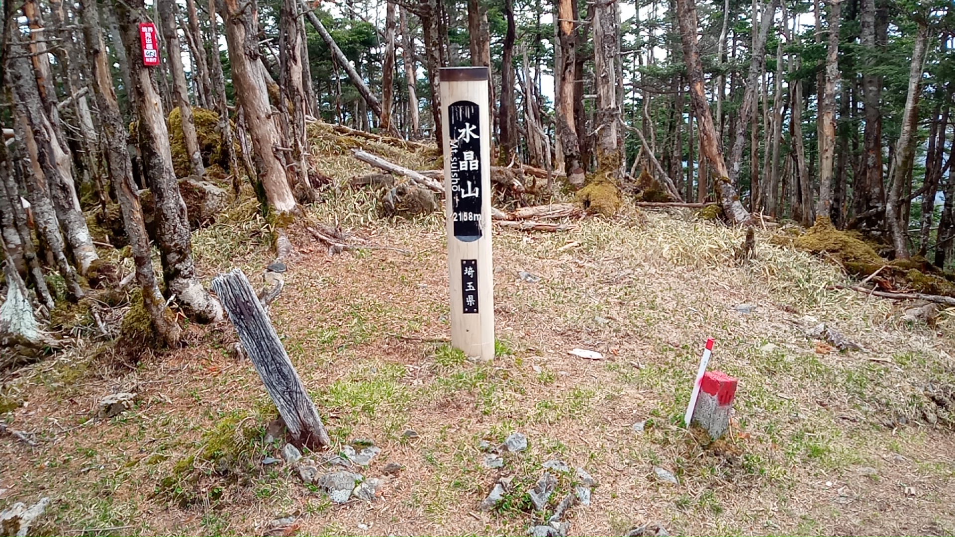 とはいえ、歩いている分には茶色い斜面が見えている訳ではない。立ち枯れた林を通り、コケの多い道を抜けると、水晶山の頂上に出た。2188m、10時20分着。