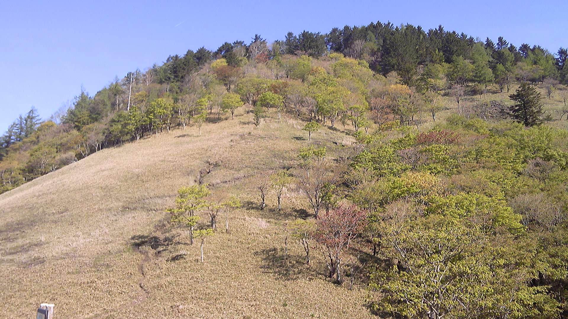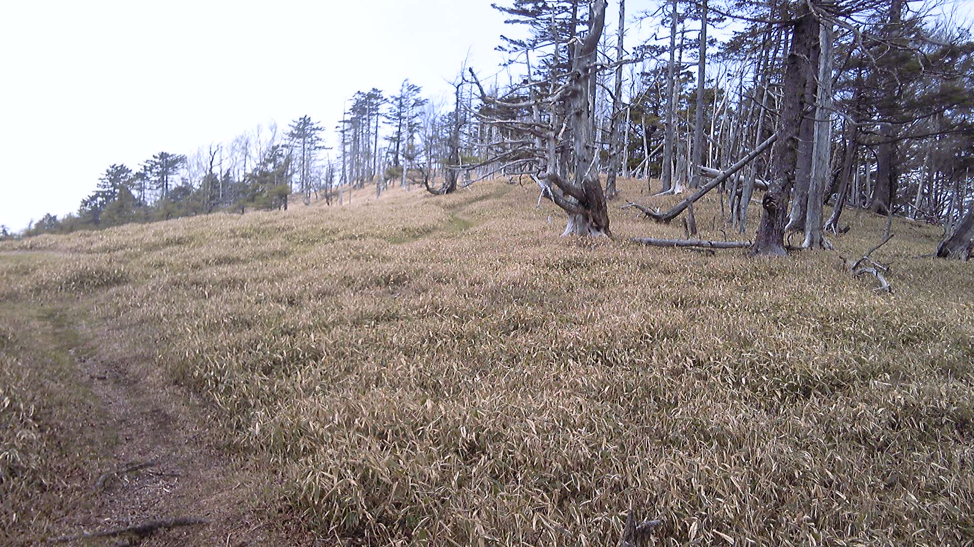 やがてまばらな林の中に入って下の見通しはきかなくなる。それでも、ちょっとした傾斜の登りは続く。雁峠から見た斜面はすでに登り切ったはずなのに、さらに奥に急斜面が続いているようだ。