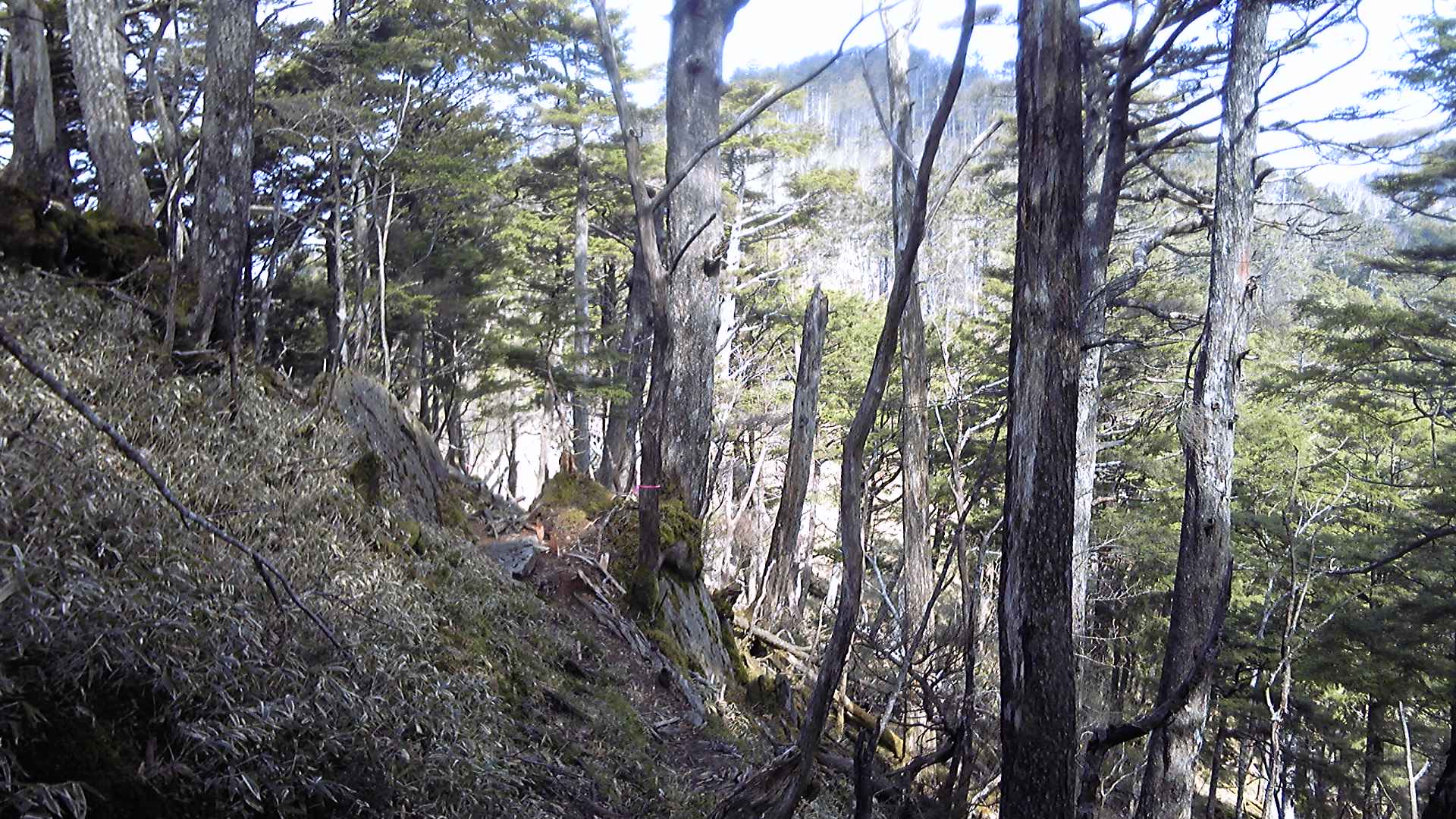 前日は一直線の急傾斜しか踏み跡に気づかなかったが、よく見るとS字型に緩傾斜の道がついている。もちろんこちらを選ぶ。傾斜はそれほどでもないが、路面に岩が出ていてたいへん歩きにくい。