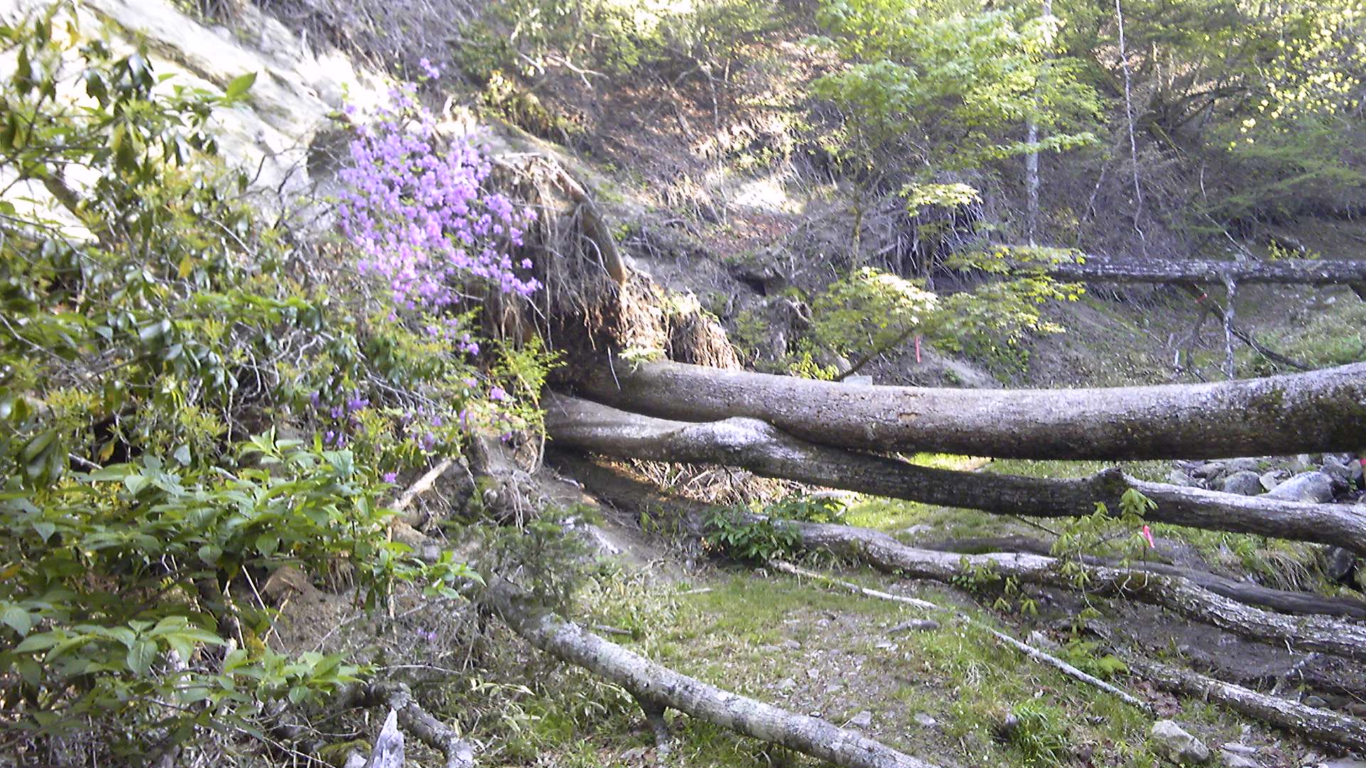 スマホが入らず天気予報が見られなかったので、大事をとって新地平に戻る。亀田林業林道では、倒木に花が咲いていた。ここは無事通過したが、この後渡渉で落水する。
