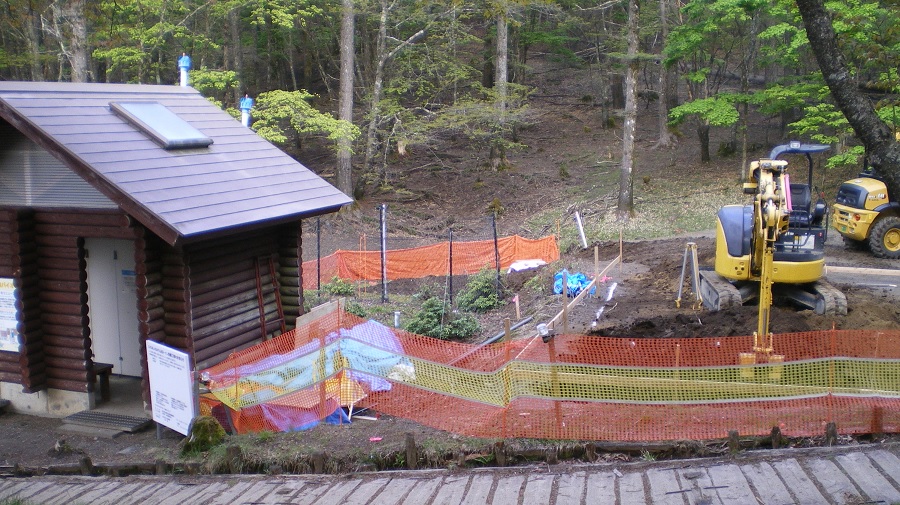 残念ながら親父さんは上がっていなかったが、工事の人達が何人かいて、ブルトーザーも日暮れまで動きたいへんにぎやかだった。バイオトイレはいまも稼働中だが、その横に新しくバイオトイレを建設中であった。