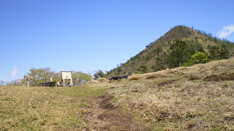 山頂への道はたいへん景色がよく、ひとしきり登った後の草原にベンチが置かれている。あるいは富士山が見える場所かもしれないが、この日は雲が多くて近くの山しか見えなかった。ベンチのある場所から、もう一度登ると古礼山山頂である。