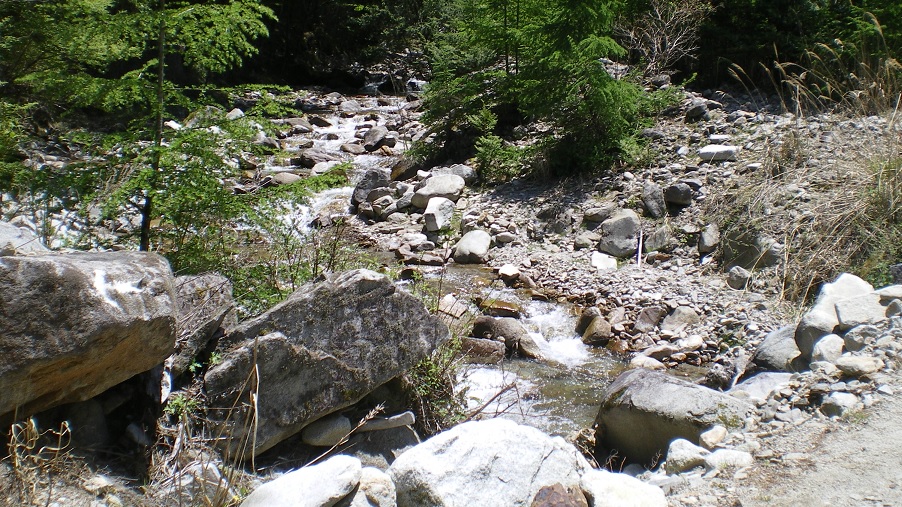 次の休憩ポイントは30分ほど進んだ分岐点。沢沿いが広くなっていて橋が架かっているが、この橋は渡らない。水分補給して先に進む。(帰り道ではここで予期しなかった対応をとらなければならなかった)