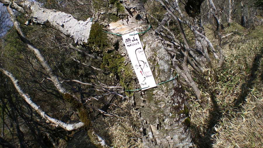 第一のピーク燕(つばくら)山かと思って休んだら、実は手前の小ピークだった。500m先というカードが立木に結びつけてある。
