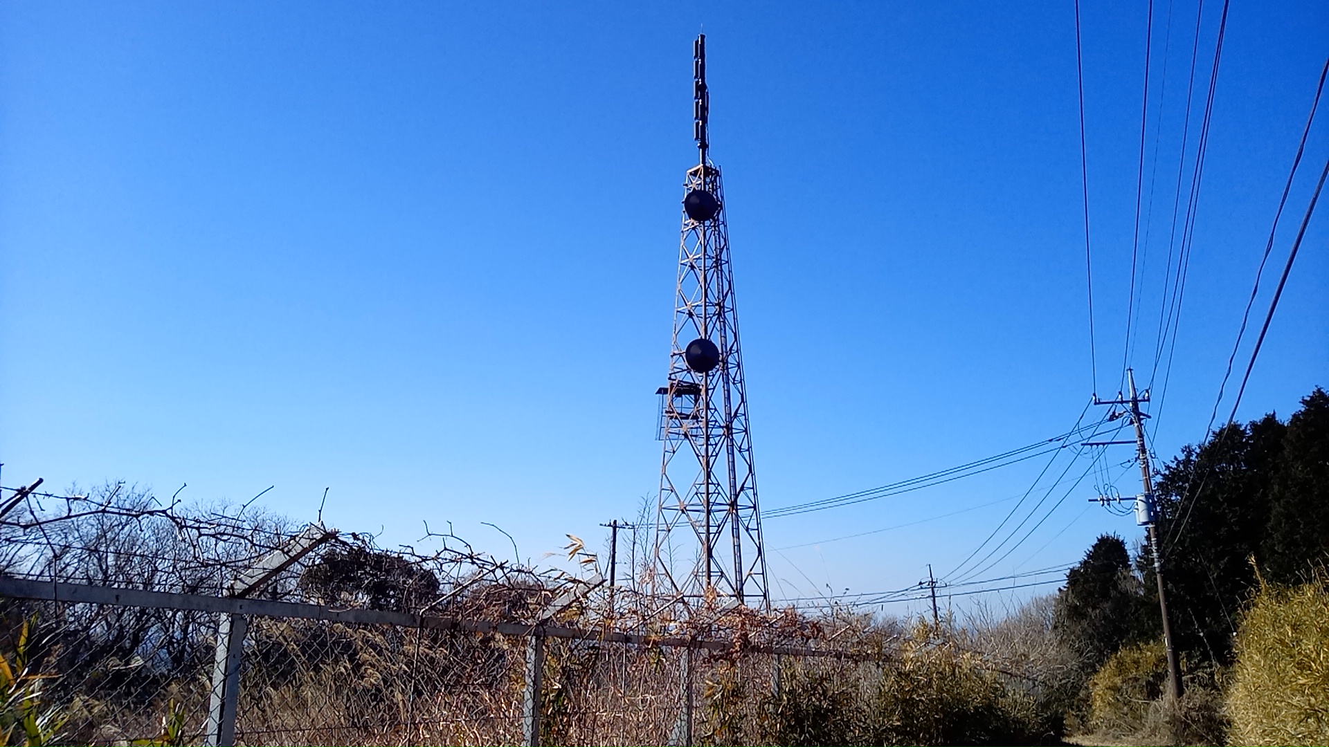 急坂コースと合流すると間もなく、朝日峠からもよく見えたアンテナ塔の前に出る。ここで少し道は狭くなるが、この先にもう一基ある大きなアンテナ塔までは車道の尾根道が続いている。