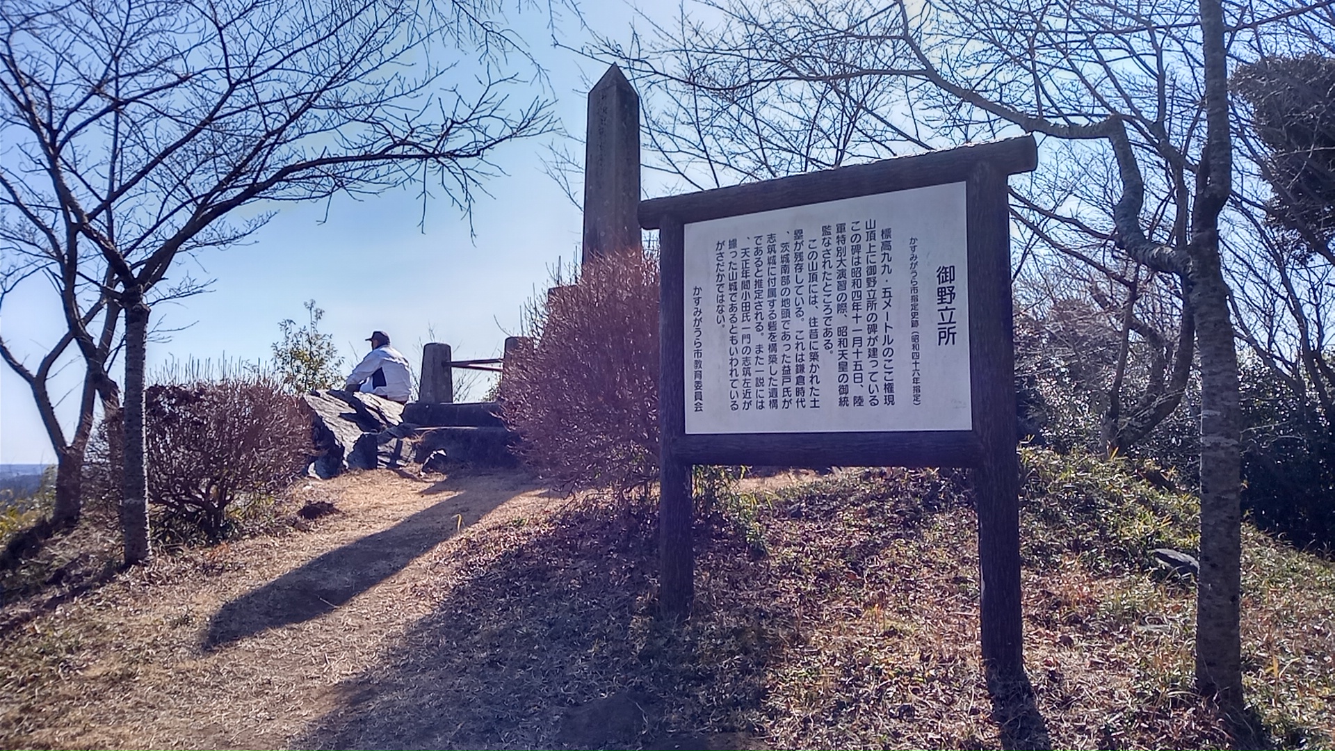権現山の見晴し台には、昭和天皇が軍隊の演習をご覧になった記念碑が建てられていて、「御野立場」と呼ばれている。雪入山より先では初めての登山者が、テーブルに荷物を置いて記念碑から麓を眺めていた。