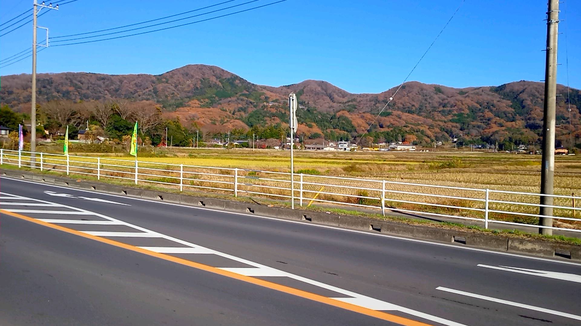 まず朝日峠からしばらく、パープルラインの車道歩きである。前回と違って、サーキットと間違えている車はいない。何しろ、ここは30km制限なのだ。10分ほど登ると、道は左右に分かれる。左はフルーツパークから旧八郷町中心部に向かう。右が雪入への道である。