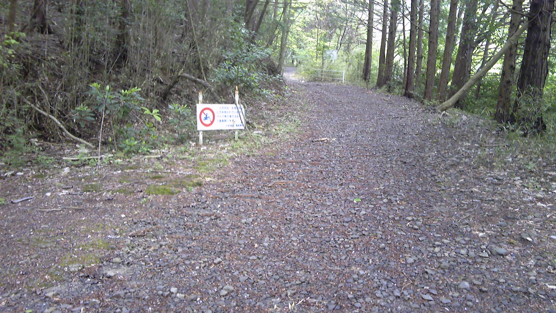 さらに5分ほど歩くと、左に分かれる舗装道路がある。通せんぼしてあったので、私道だといけないと思い先に進む。しかし、道は下る一方である。100mほどで引き返してよく見ると、通行止めゲートの横に踏み跡があった。