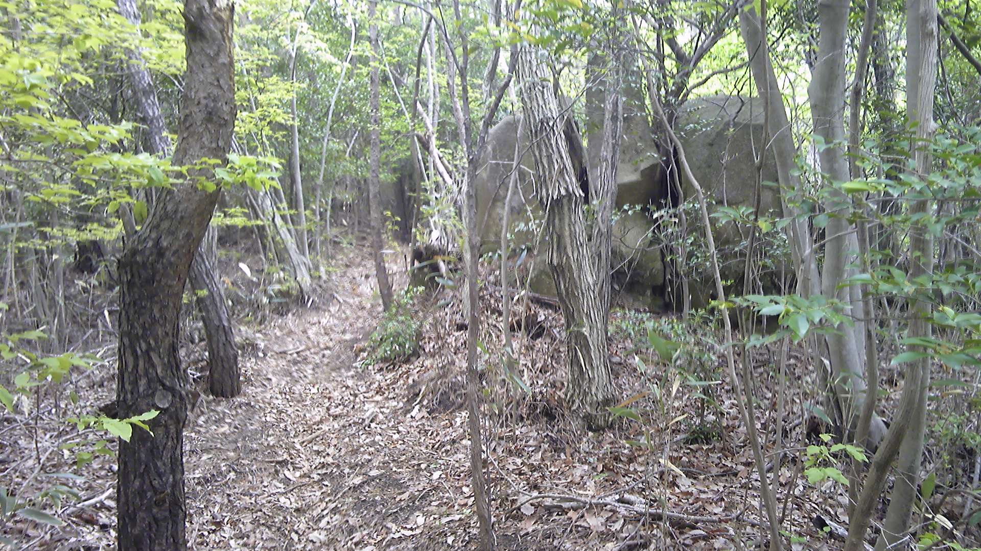 宝篋城の中心部には初めて入ったが、大きな石がいくつかあって周囲に土塁や空堀があるだけで、それらも説明してなければ自然の地形かと思うくらいである。広さ(狭さ)といい石だけなことといい、水の手が見えないことも含めて、近くの難台城とよく似た感じである。