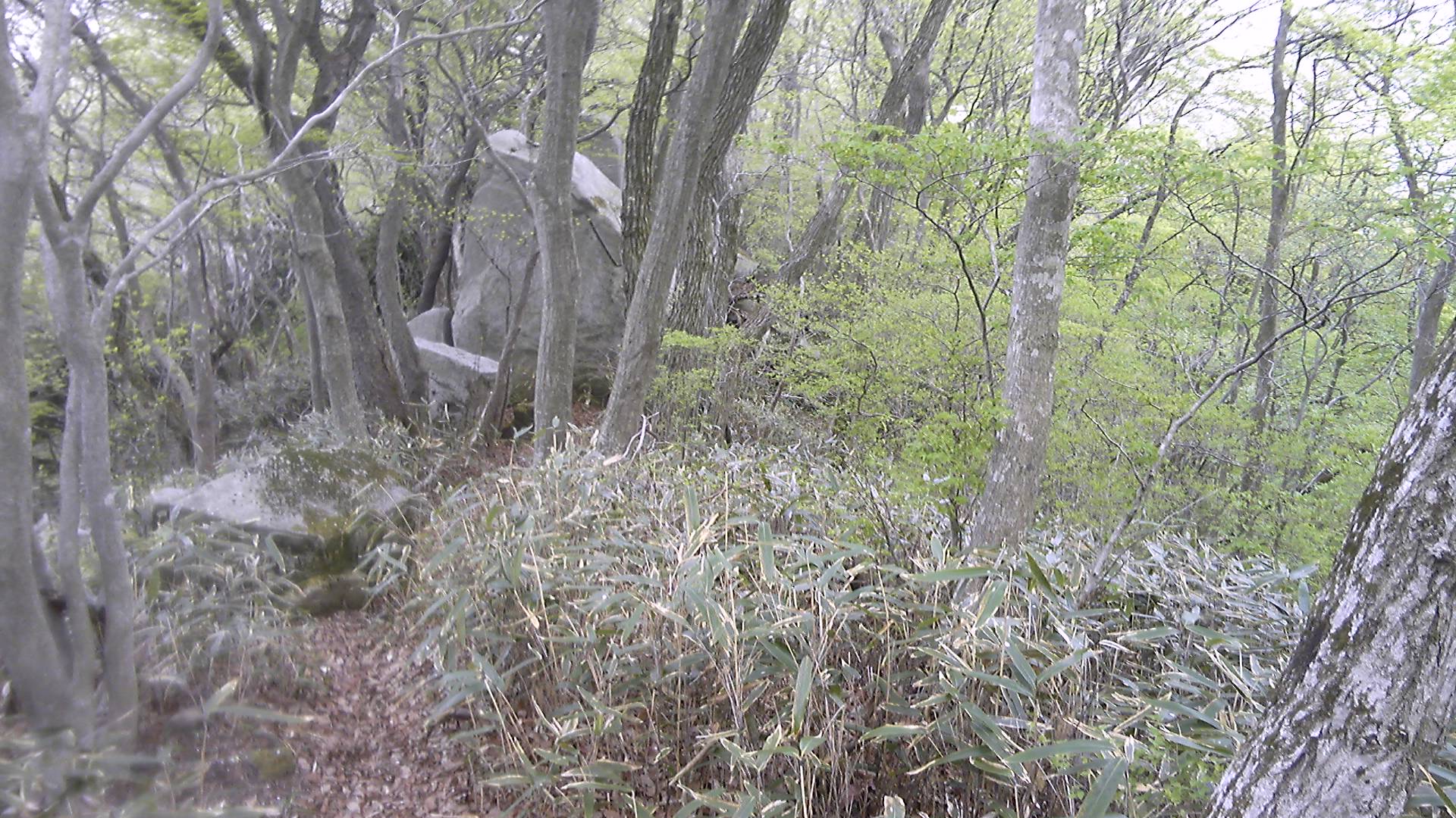 ひとしきり下って再び登り坂となる鞍部のところが「A-4分岐点」。ここを下ると小町の館方面に行けるはずなのだが、行先案内も赤テープもない。ただ、しっかりした登山道がここから下っていて、間違いようのない道である。