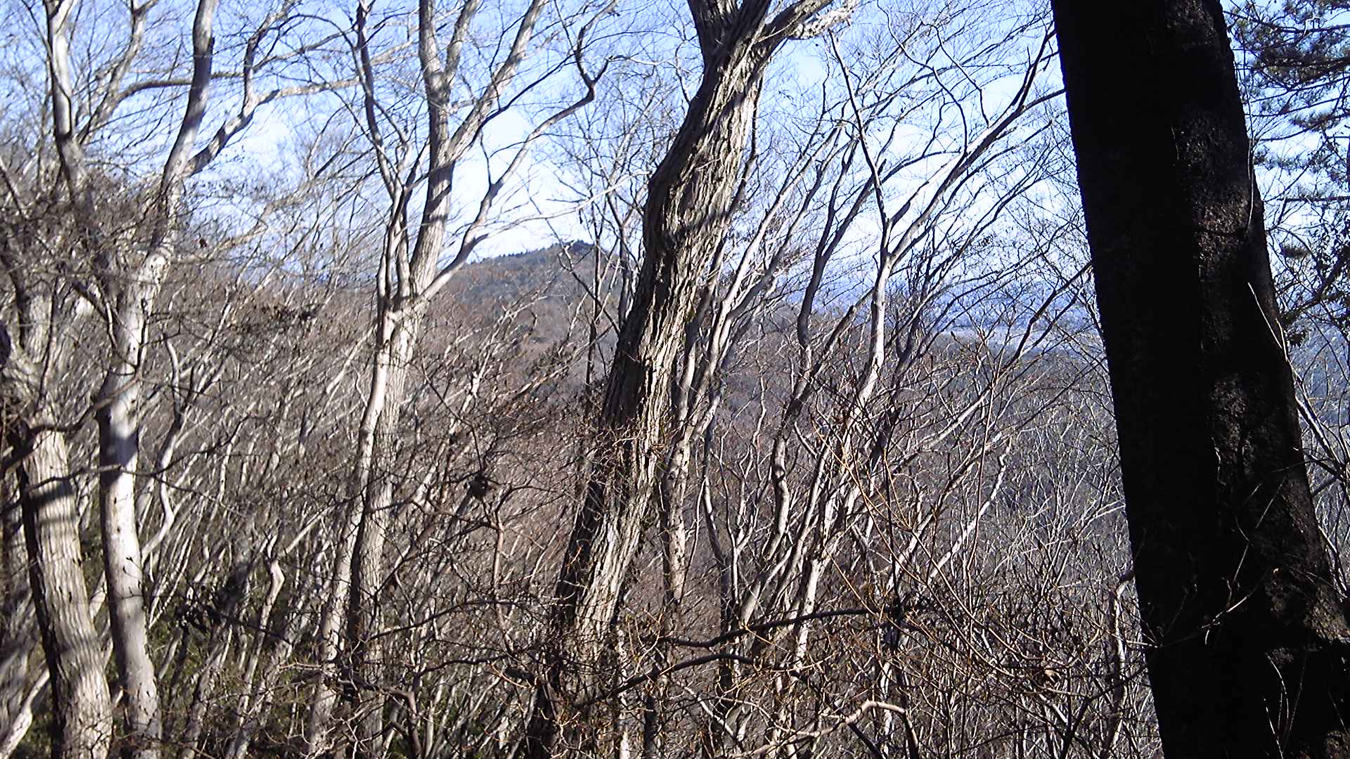 そして、樹間から次の大きなピークである浅間山が見えてきた。このピークにはお宮さん(何しろ浅間山である。多くの祠がある)と、雪入山系恒例のアンテナが立っている。巻き道があるので、今回はここは通らない。