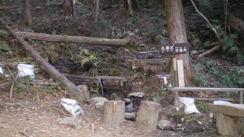 10分くらいで、洗顔沢休憩所という水の出ている場所に着く。「この水は飲めません」と書いてあるが、名前のとおり顔を洗う沢だろう。沢の水をすくいやすくするための樋がかけられている。さすがにこの時期は冷たいけれども。