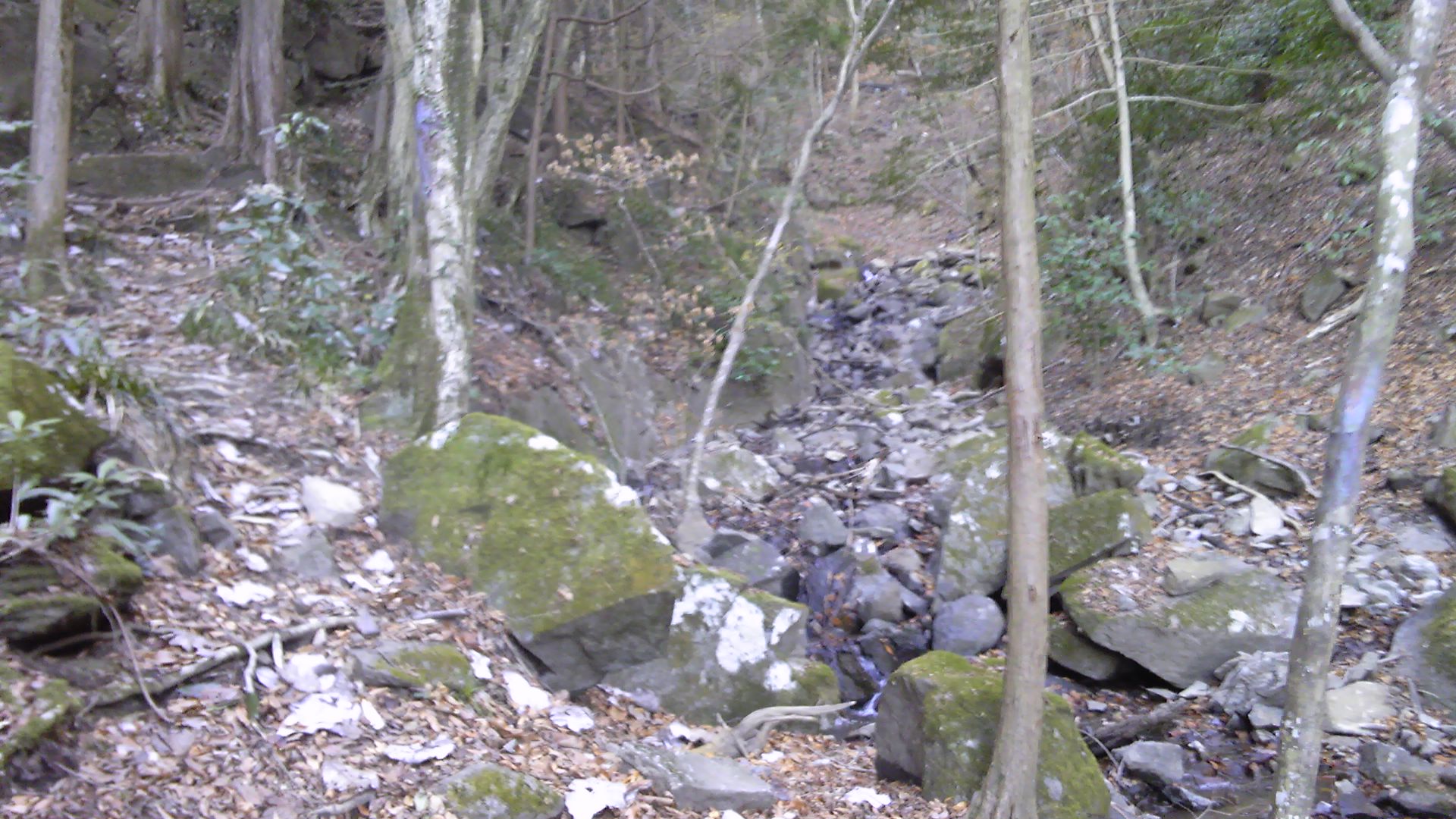 踏み跡は左岸になったり右岸になったりして続く。木に付けられた赤ペンキが執拗に消されている。