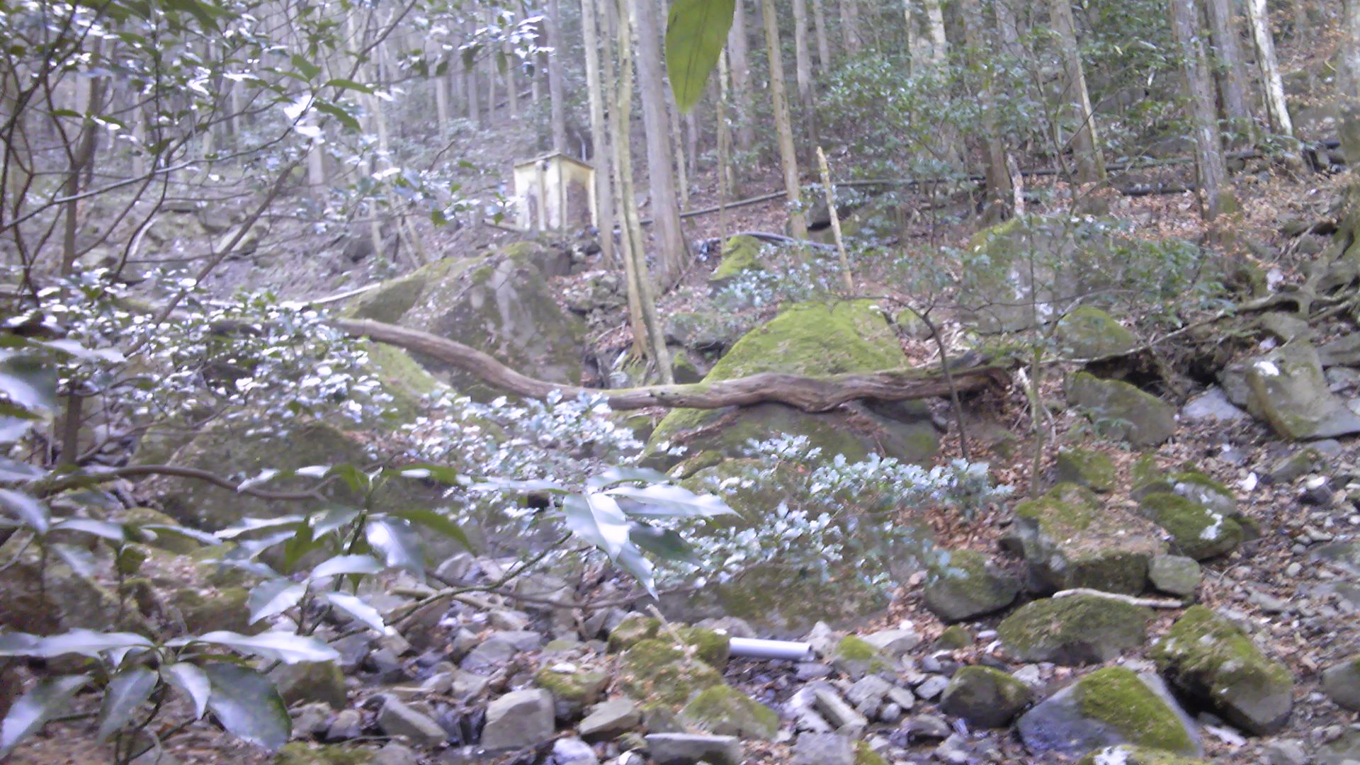 斜面をトラバースして進むと、対岸に取水タンクがあった。ということは、この道で合っているということである。踏み跡は取水タンクの近くは通らず、しばらく右岸を進む。