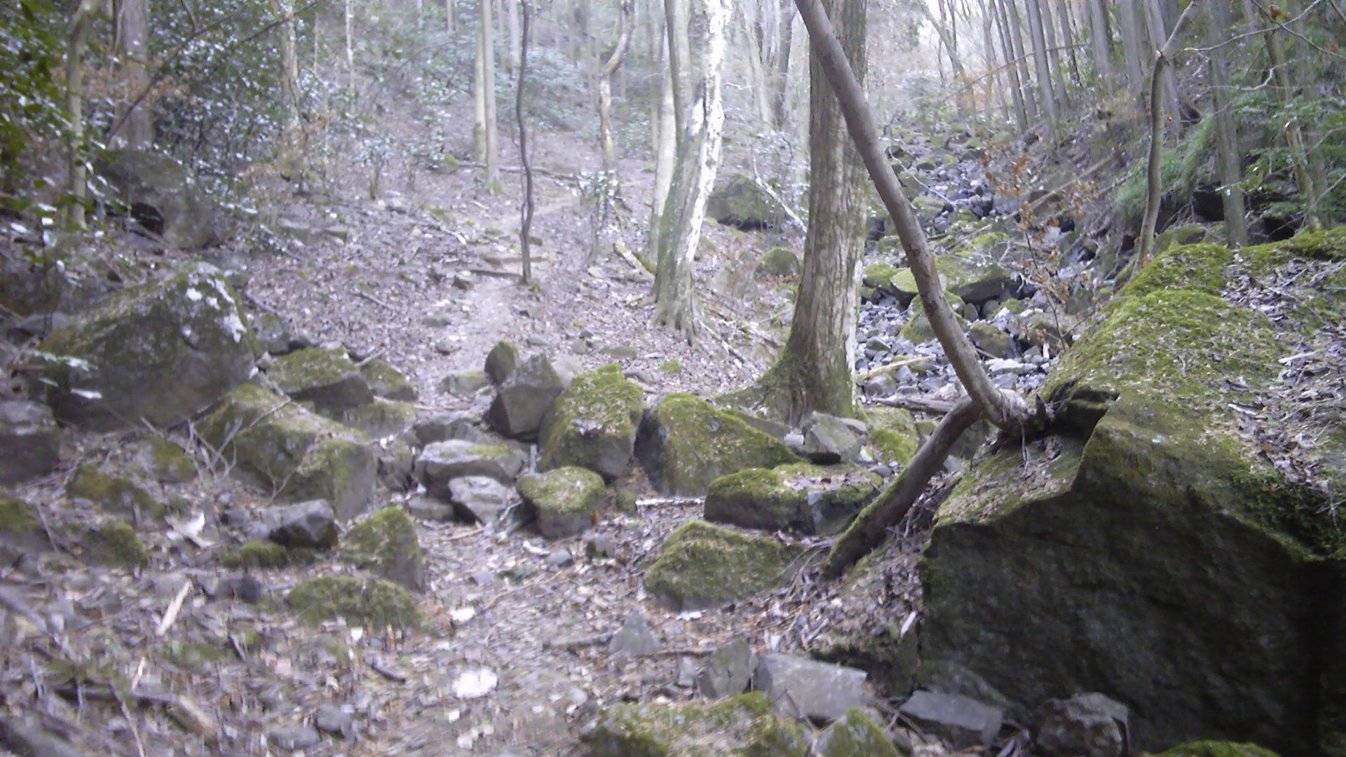 五輪塔から30分も下りた頃だろうか、行く手に太い道が現われた。これまでは踏み跡だが、今度ははっきりした登山道である。尾根から遠ざかる道だが、起伏もなく道幅も広い。ここを進めば登ってきた道に合流すると思われた。