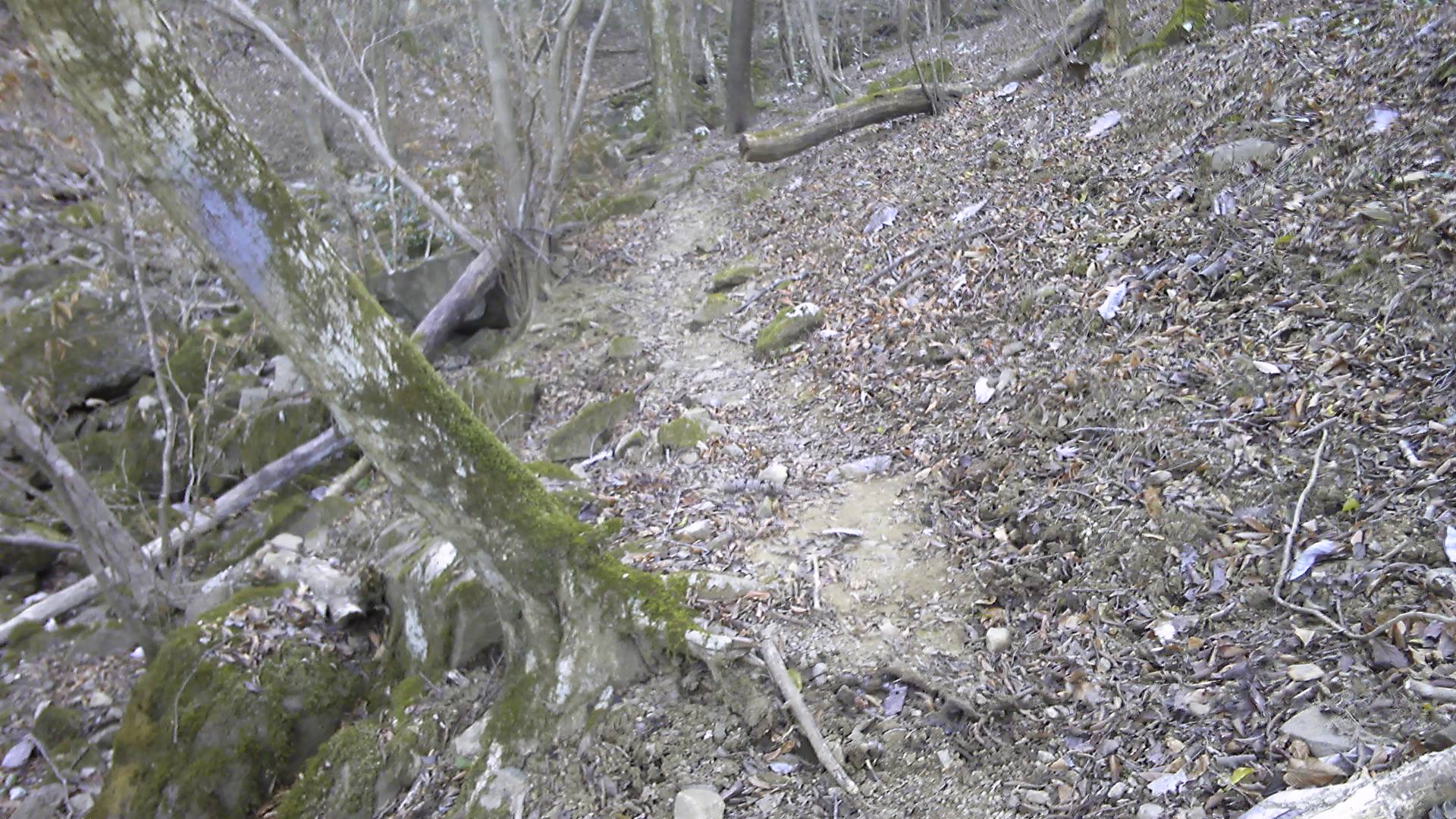 しばらく林道を下り、案内に従って左の細い道に入る。ここから約1kmがワイルドな山道である。「8」のマークが要所に貼ってある(8は東筑波コースの番号)けれど、微妙な踏み跡がところどころ伸びている。