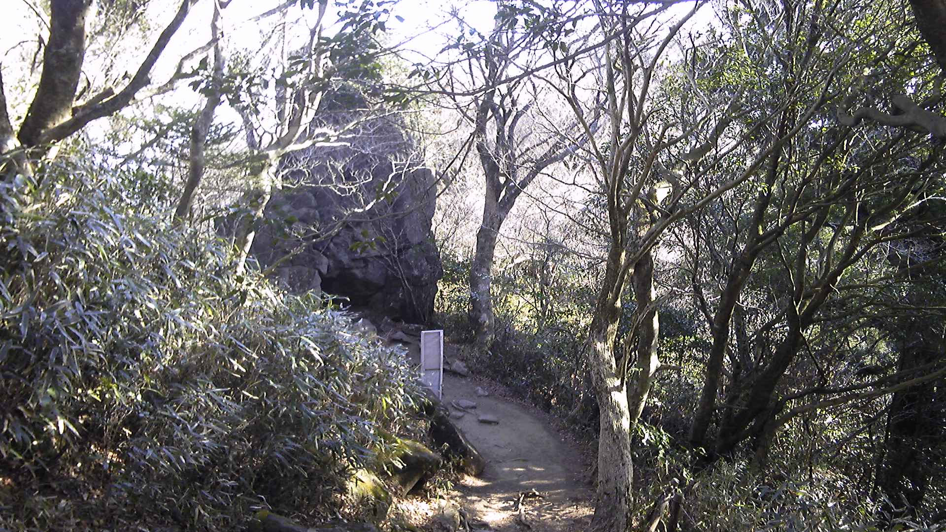 岩の間の踏み跡を登っていくと、突き当りに岩屋のような大きな巨岩がある。注連縄や案内板こそないものの、行場に使われそうな岩屋である。そこから先は太い登山道となり、推奨道のキャンプ場コースまで続いていた。