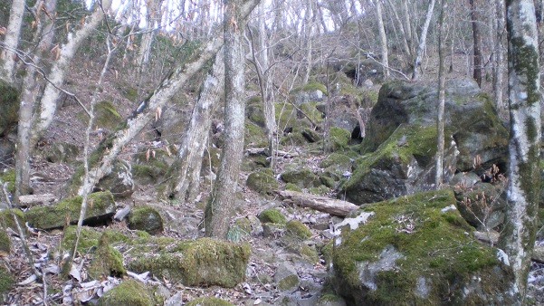 2度ほど落ち葉に足をとられ尻餅をついた。そして気がつくと、目の前に岩場の尾根が見える。迷ったら谷に向かわず尾根に登るのは鉄則である。尾根に登ると、岩場の間に道が続いている。