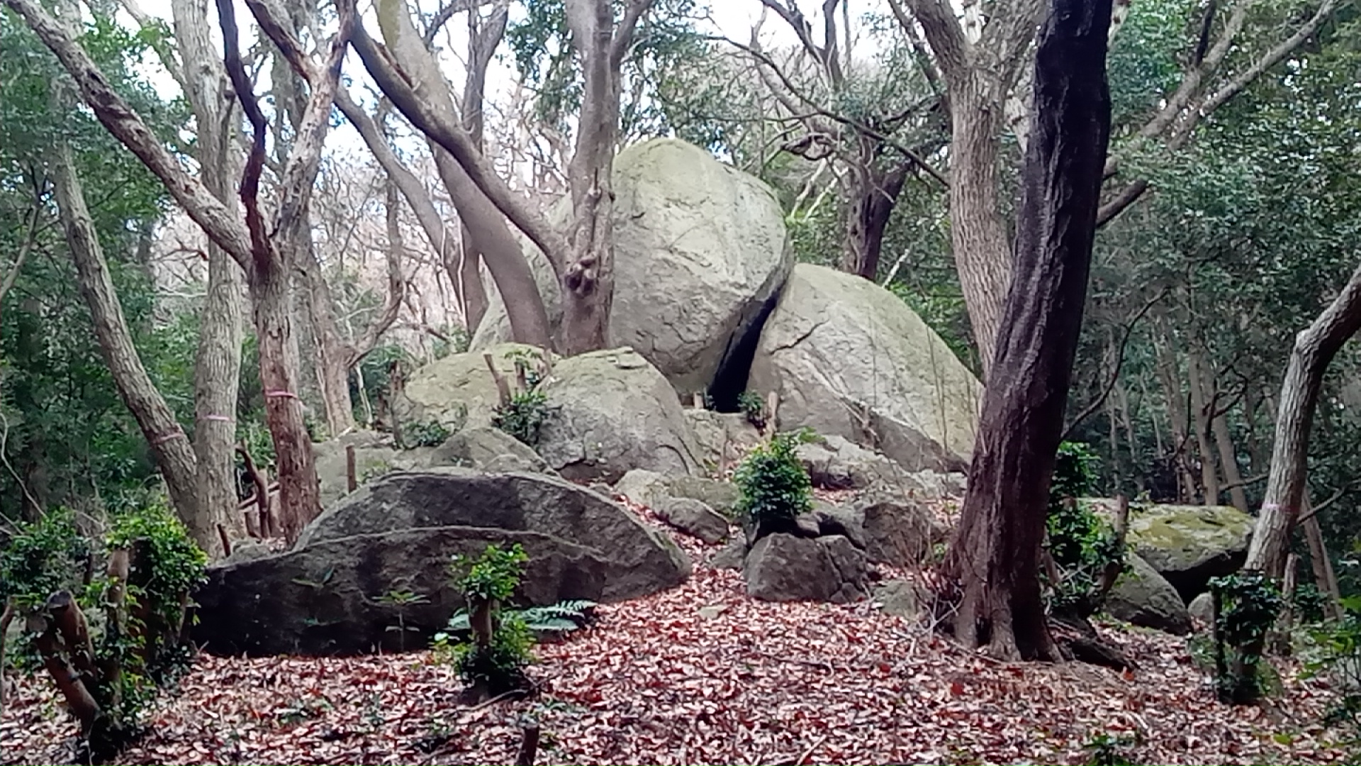 幸い、富士見岩には誰もおらず、進入禁止を見咎められることはなかった。大きな岩を回り込んで下ると自然研究路からは見えない。この道は梅林ルート(猿田彦神社ルート)、石置尾根共通の研究路側出入口となる。