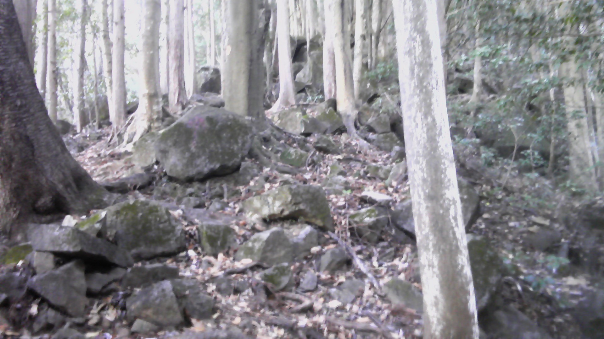一時間ほど下り、休めそうな岩場があったので一息つく。あるいはここが人面岩かと思ったが、ずいぶん下なので違う場所である。おそらく、どのルートでも岩場になる標高550mくらいだったと思われる。