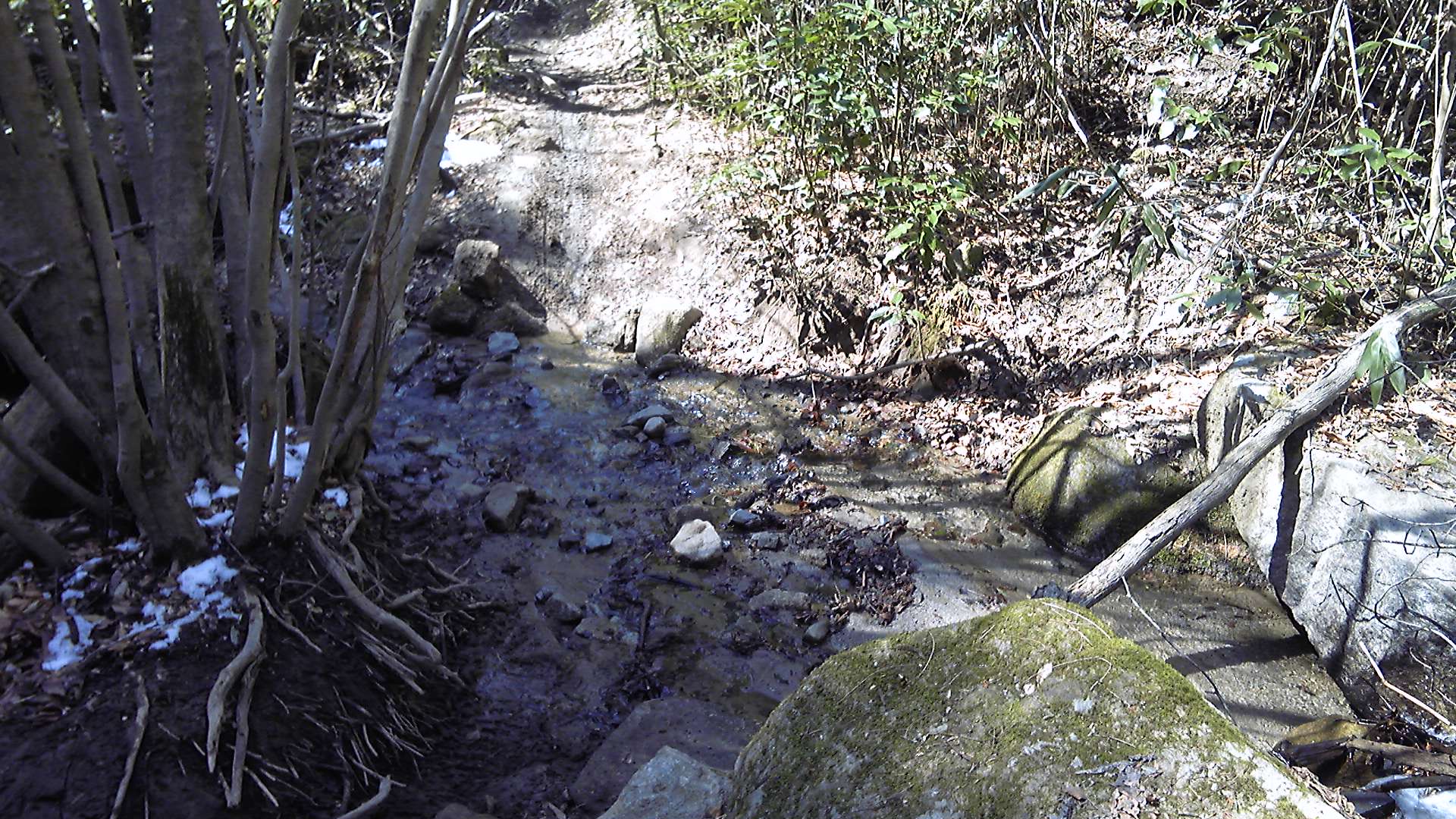 やがてこの道は水の流れる沢沿いになり、沢を渡って対岸に渡る道も見える。とはいえ、直進した先で道が太くなっているので、渡らずにそのまま進む。