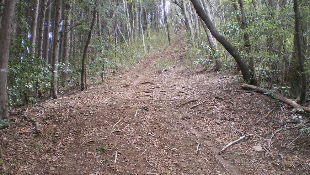 そして、もうひとつの難所・猪転げ坂(ししころげざか)が現われた。真ん前にスイッチバックの急坂があるのだが、途中から上は木々に隠れて見ることができない。とはいえ、奥多摩のスイッチバックに比べれば、何ということもない。