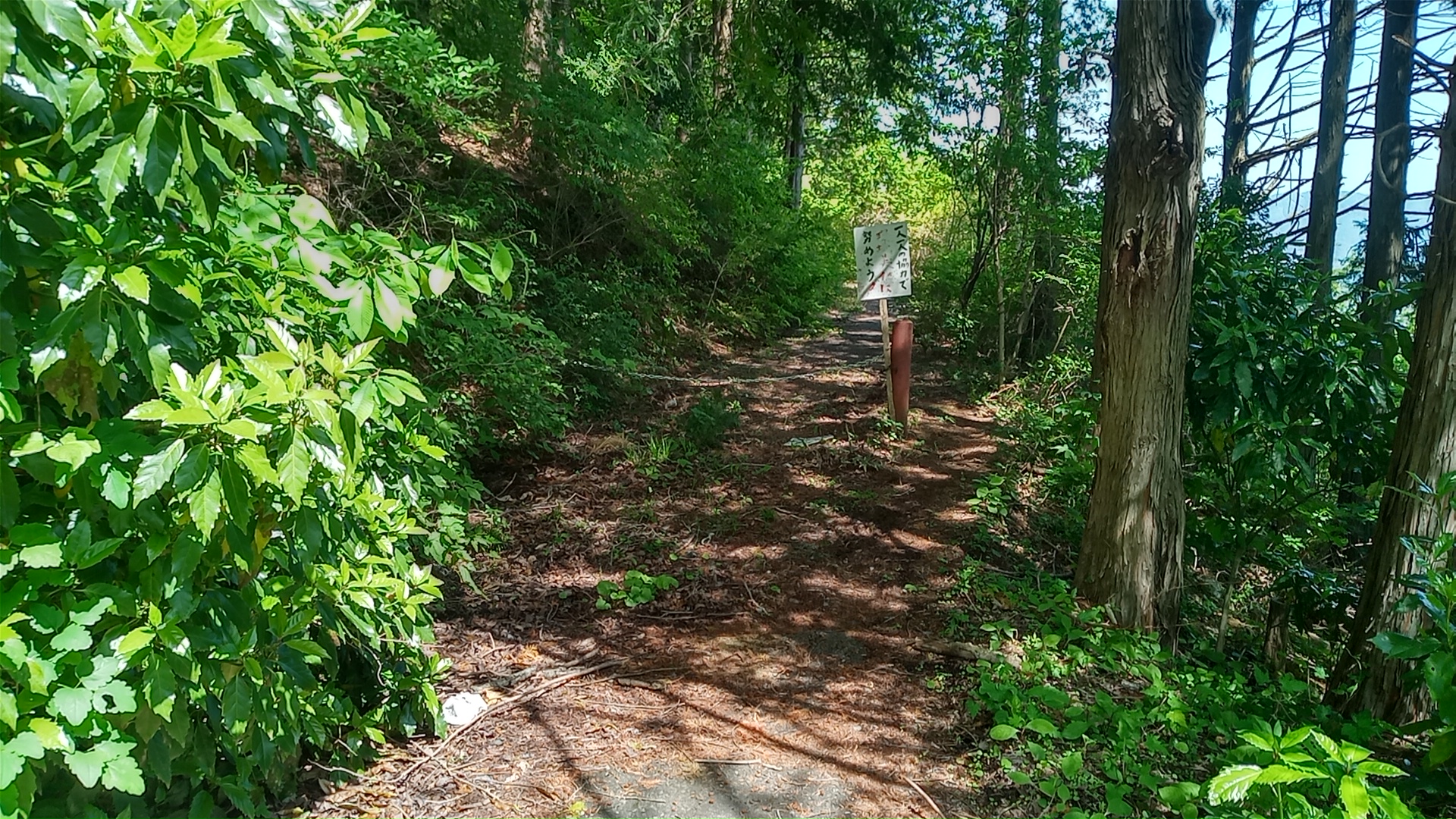 林道のヘアピンカーブが登りつめるあたりで合流し、分岐点には黄黒のトラロープが張られていた。「天罰下る」は貼ってなかったので、おそらく車両通行止めの意味かと思われる。