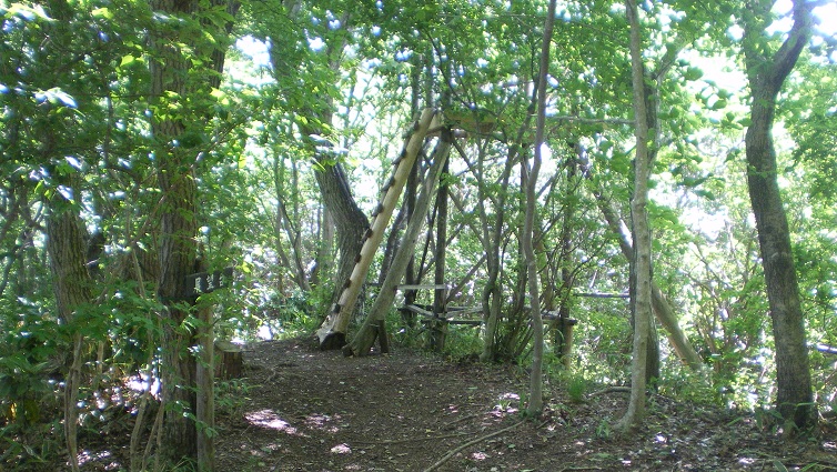 はじめは大きいベンチしか見えなかったのだが、「展望台」という立札が立っている。木々に囲まれて、高さ5mほどの木組みの塔があった。展望台というより物見やぐらといった方がイメージに合う。