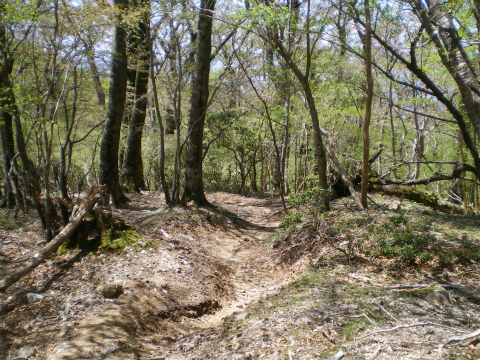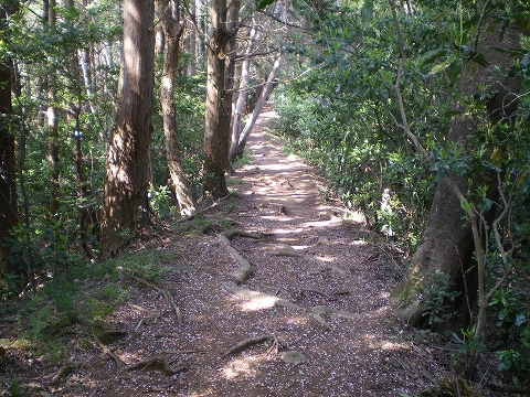 それを除けば、たいへん快適なハイキングコースであった。起伏のゆるやかな尾根道は沼津アルプスではほとんど見たことがなかったのに、ここではしばらく続く。加えて足下が腐葉土というのか、黒土が主体でほどよくクッションが利いて歩きやすい。このまま下山口まで続いてほしいと思う。