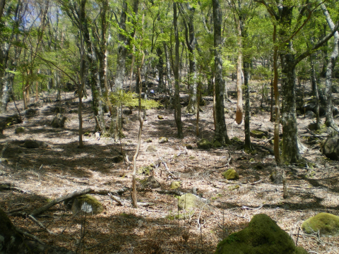 あたりを見回すと、ほとんどはブナである。幹が灰色で曲がりくねって、根元の方はコケが生えている。しかし、時々茶色のまっすぐな幹が混じっている。最初は鹿に表皮を食べられたブナかと思っていたのだが、それにしては鹿ではとどかないほど上まで茶色である。帰ってから調べてみるとヒメシャラであったようだ。家の庭にもあるのだが、あんなに大きくなるとは驚いた。